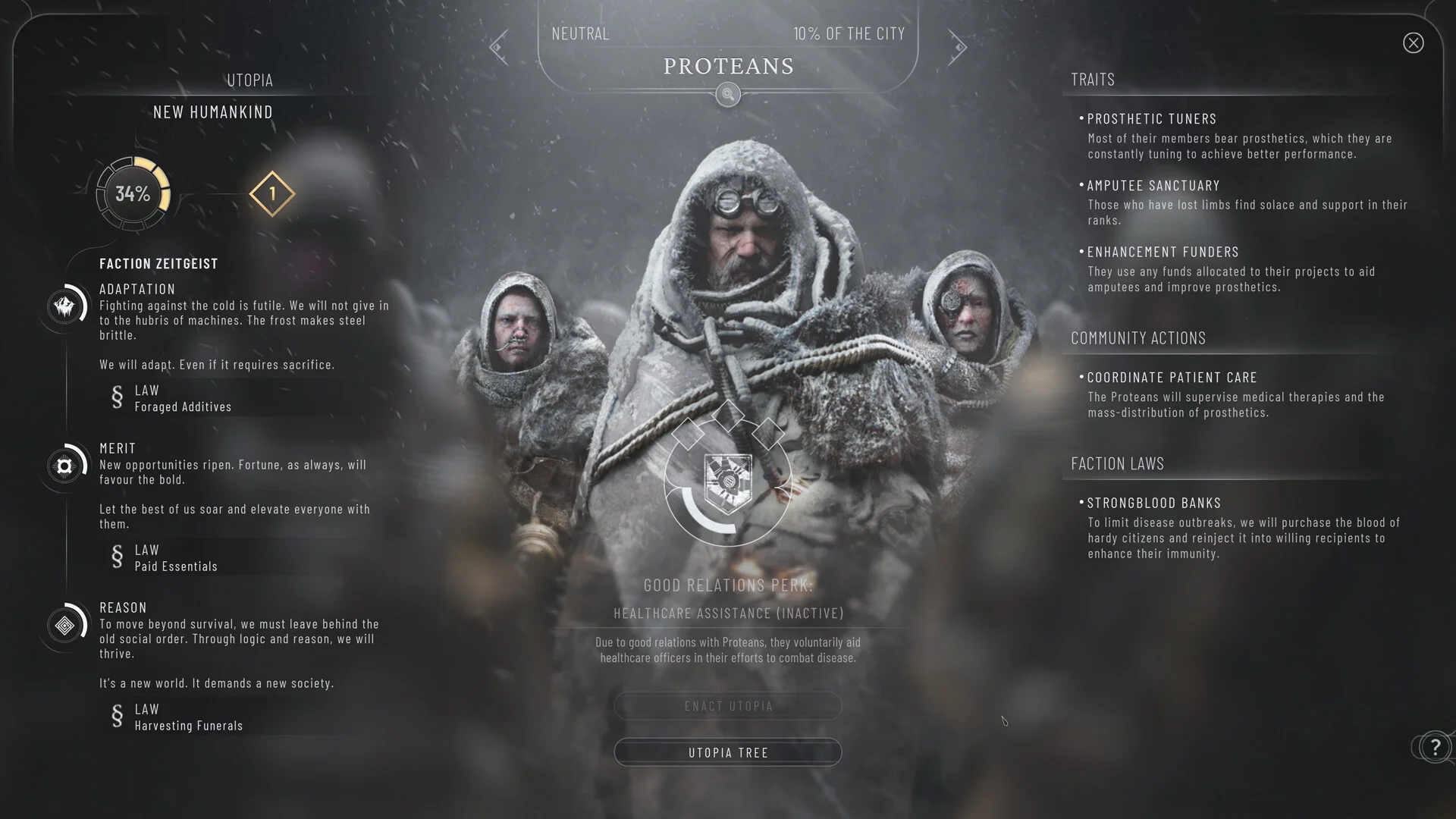 本作の核となるのは、個性豊かな派閥システムです。たとえば「Proteans」は過酷な環境に適応するため、自らの肉体をも変革することを厭わない人々として描かれています。各派閥には専用の「Utopia Tree」(技術ツリー)が用意されており、血清による体温上昇技術など、それぞれの特色を活かした独自のアップグレードが可能です。