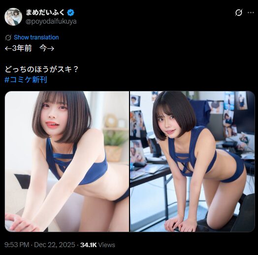 コスプレイヤーのまめだいふくさんが12月22日、「←3年前 今→ どっちのほうがスキ?」というコメントとともに過去と現在の比較写真をXで投稿しました。